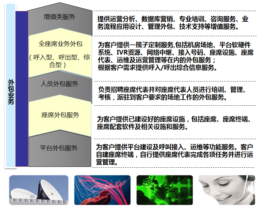 為客戶提供一攬子定製服務,包括機房場地、平台軟硬件係統、IVR資源、網絡中繼、接入號碼、座席設施、座席代表、運維及運營管理等在內的外包服務;根據客戶需求提供呼入/呼出綜合信息服務。